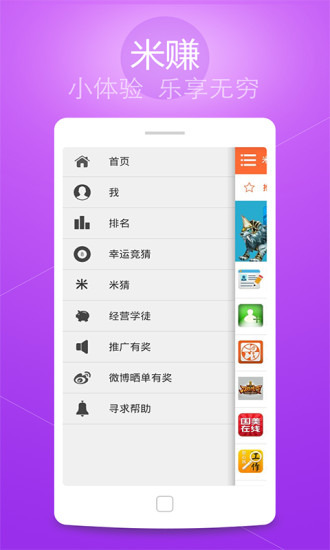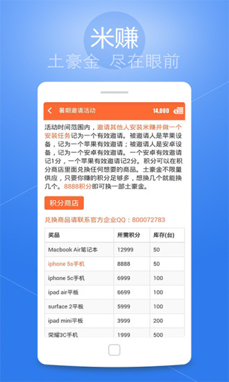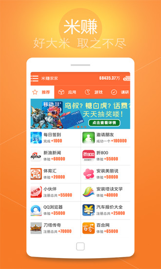 安卓版下载 大小:3.30 MB 下载:3256次 米赚 支 持:Android 2.3以上 分 类:手机游戏 大 小:3.30 MB 版 本:2.80 评 分: 开发者:北京米拓世纪科技有限公司 下载量:3256次 发 布:2020-03-14 10:05 手机扫码免费下载 #米赚截图 #米赚简介 米赚由北京米拓世纪科技有限公司研发并运营,在2011年9月正式发布,是国内第一个专注于移动威客的手机应用,拥有3000万用户,是国内外知名的手机赚钱应用。 安装后完成新手任务即可兑换1Q币!也可兑换话费、提现到支付宝和微信等等!